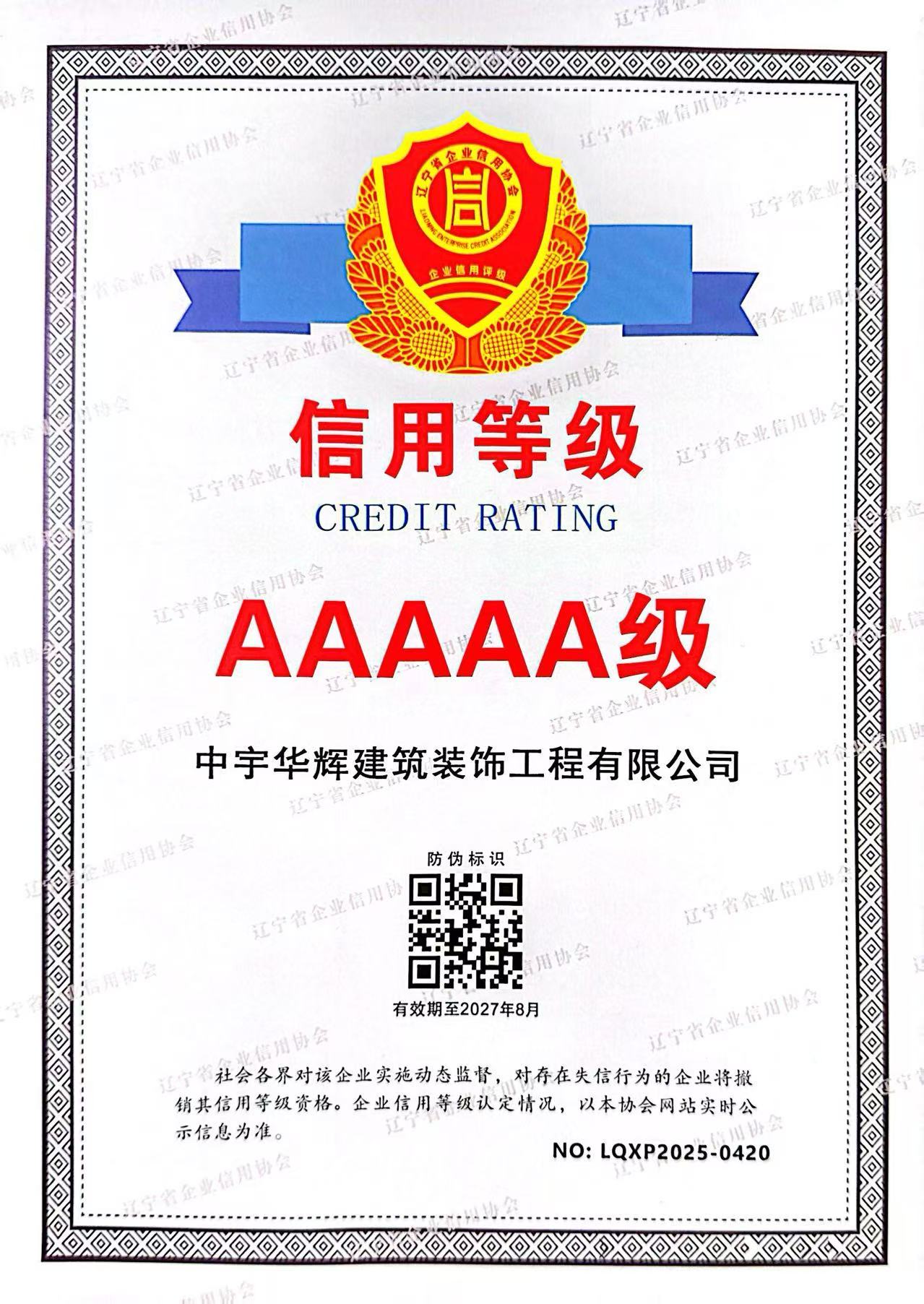 AAAAA级信用等级证书